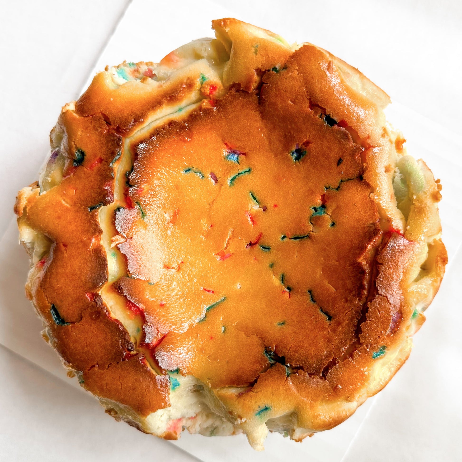 A decadent chocolate brownie layer, topped with a velvety smooth rainbow sprinkle cheesecake batter; baked together and burnt to perfection — this rich and creamy Birthday Basque Cheesecake is sure to be a sweet addition to any celebration!